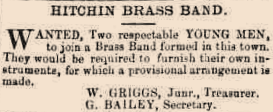 This is our first real indication of the formal establishment of the Hitchin Brass Band, with a requirement for two men to build sufficient numbers and an organised committee to manage its affairs. But who are Griggs and Bailey?