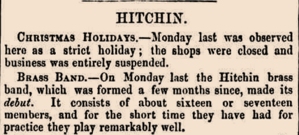 There are a number of reports regarding the debut performance of the band, which would have taken place on 24th December 1866. On 29th December 1866, in the Hitchin column of the Hertford Mercury and Reformer, we read,