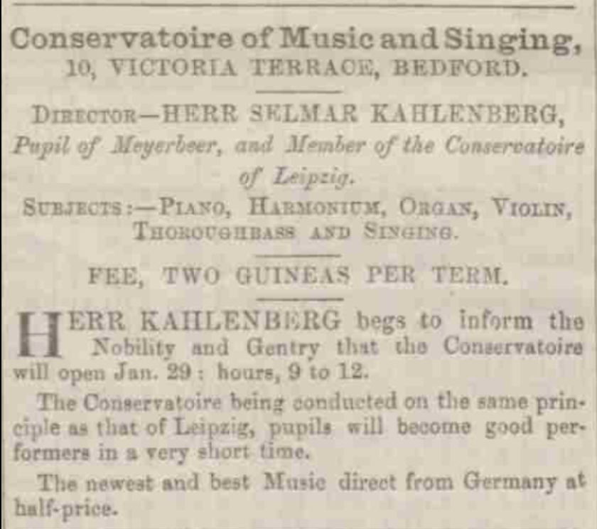 In June 1866 Kahlenberg married Frederica Dubi, of Tilehouse Street, Hitchin. Frederica was also either Russian or German born and a tutor of modern languages. In January 1867, Selmar opened a Conservatoire of Music and Singing in Victoria Terrace, Bedford, promising that for a fee of two guineas per term, “pupils will become good performers in a very short time”.